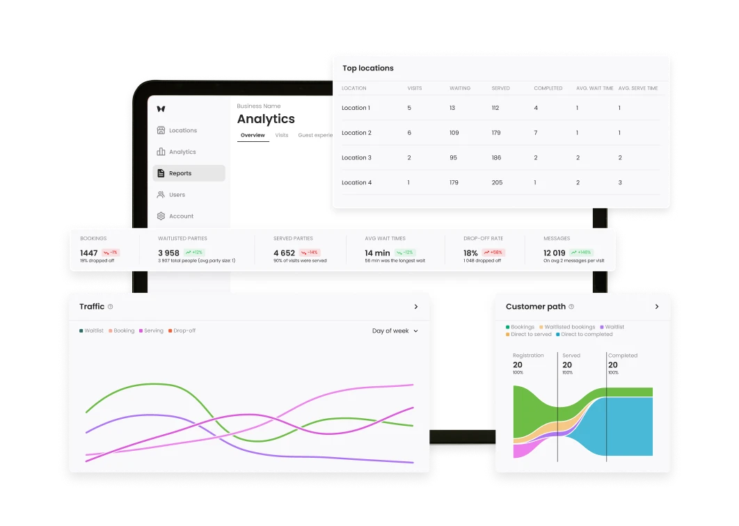 Olvídese de las conjeturas con los análisis y los informes de Waitwhile. Mejore la gestión de colas con información para acortar las filas, optimizar los recursos y mejorar las experiencias de los clientes en todas las ubicaciones.
